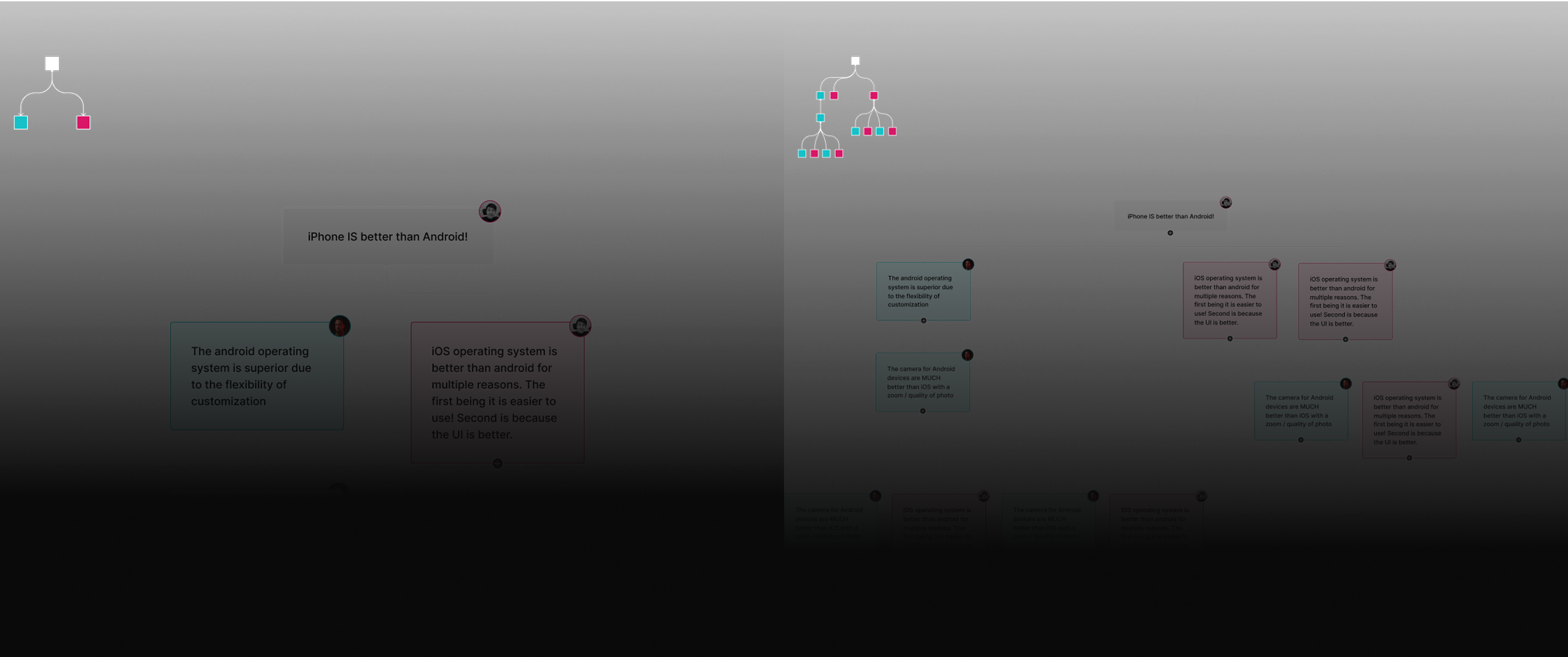 This question gave birth to the debate tree. A tree (node) structure allows for a visual way of representing a debate and enables debaters to engage per conversation point. This is where the fun comes in. Each debater would then be able to add their points on the previous rebuttal.